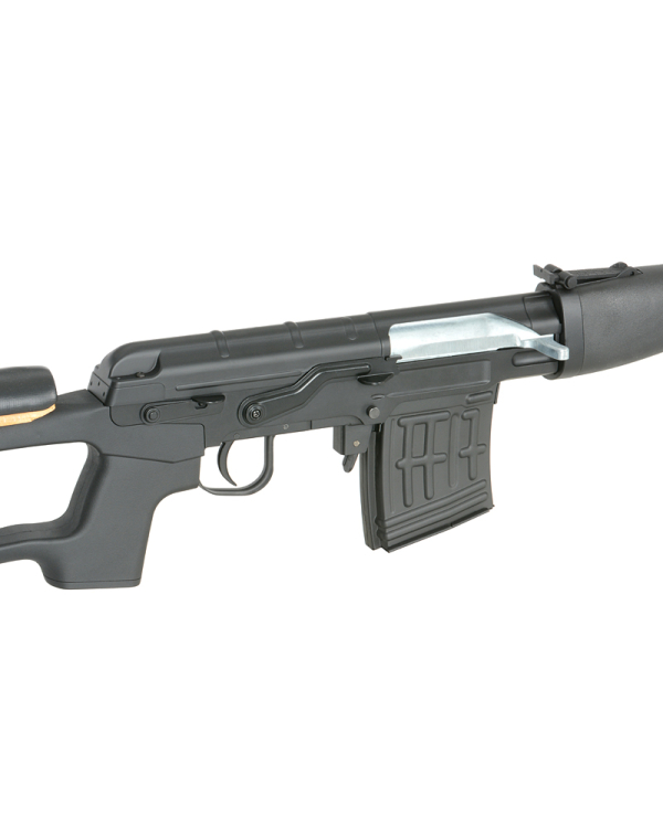 AGM copiaza in linii mari modelul Dragunov. Este o replica manuala, ce ofera un raport pret/bila trasa excelent. Este realizata atat din metal dar si din plastic ABS. Designul sau este cat mai simplu si cat mai eficient. Designul de asamblare este simplist permitand o intretinere usoara in tmip. Teava externa este din metal iar ulucul este realizat din plastic ABS. Deasemenea si patul replicii este realizat din plastic ABS. In partea dreapta exista selectorul de tir ce reprezinta si siguranta. Replica este prevazuta cu un sistem rudimentar de ochire dar si cu o sina incastrata pe partea stanga, ce va permite montarea unei prinderi si a unei lunete. In spatele selectorului de tir exista butonul pentru indepartarea capacului superior. In partea din spate, exista montat pe pat un reazam pentru obraz ce imbunatateste confortul. Butonul pentru indepartarea incarcatorului este ambidextru.