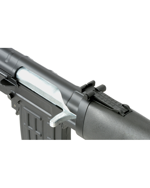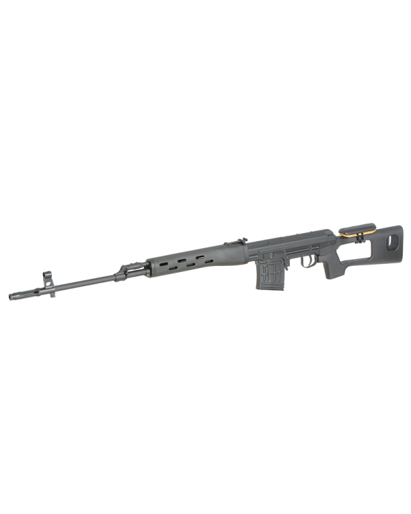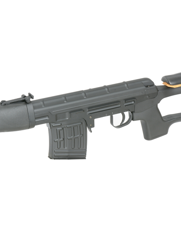 Lung... cam asa ar putea fi descris prezentul sniper. Aceasta replica de Dragunov este fabricata de AGM si functioneaza manual pe baza de arc. E simplu, la fiecare armare o bila este alimentata si un piston este armat. La tragerea tragaciului acest piston este eliberat iar bila este propulsata pe teava. Un principiu simplu si eficient. Este realizat in mare parte din metal iar designul sau este cat se poate de simplist. Odata montata o sina si o luneta, aceasta relica de airsoft va constitui o adevarata problema pentru adversari.
