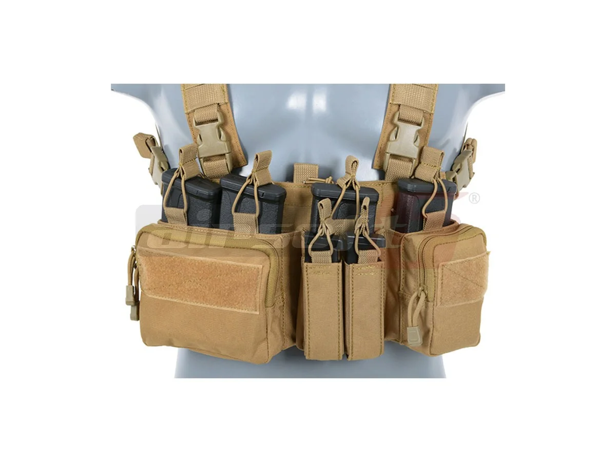 Tactical harness model buckle up Recce Chest Rig manufactured by 8Fields. This tactical system allows the attachment of a wide range of accessories equipped with the MOLLE attachment system. Straight from the source, it features 4 magazine pockets secured with elastic bands. The materials used, design, and attachment systems ensure optimal comfort and exemplary utility.