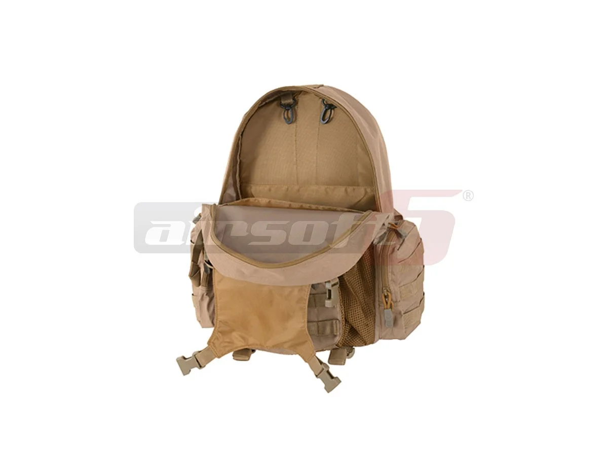 Tactical backpack by 8Fields made from waterproof 600D nylon. This backpack can be used in military operations or daily activities at school or work. It is very comfortable due to the soft absorbent padding on the contact area. It can be easily adjusted and secured. Its compartmentalization is useful and well-proportioned. It allows for easy mounting of a hydration bladder or transport of a laptop.
