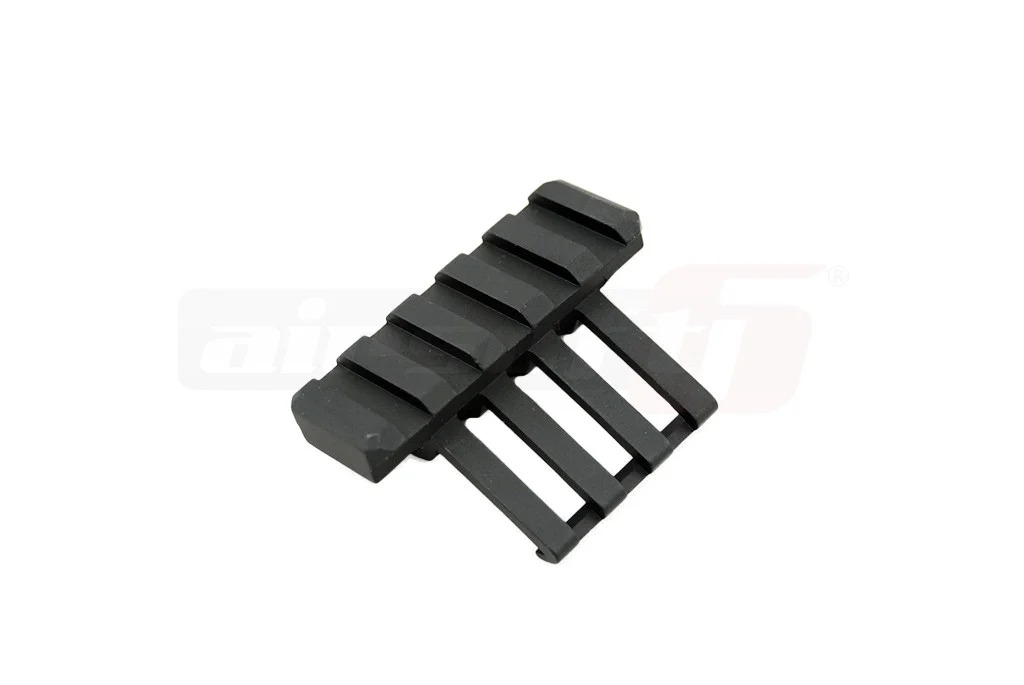 This device allows the repositioning of the replica's rail at a 45-degree angle. It is made of aluminum and is secured in place with 2 hex screws. Once fixed, it will provide the user with a standard rail section on which they can mount devices such as sights or even flashlights at a different angle than the original rail. One example of use is the ability to attach an electronic optical device simultaneously with a scope.