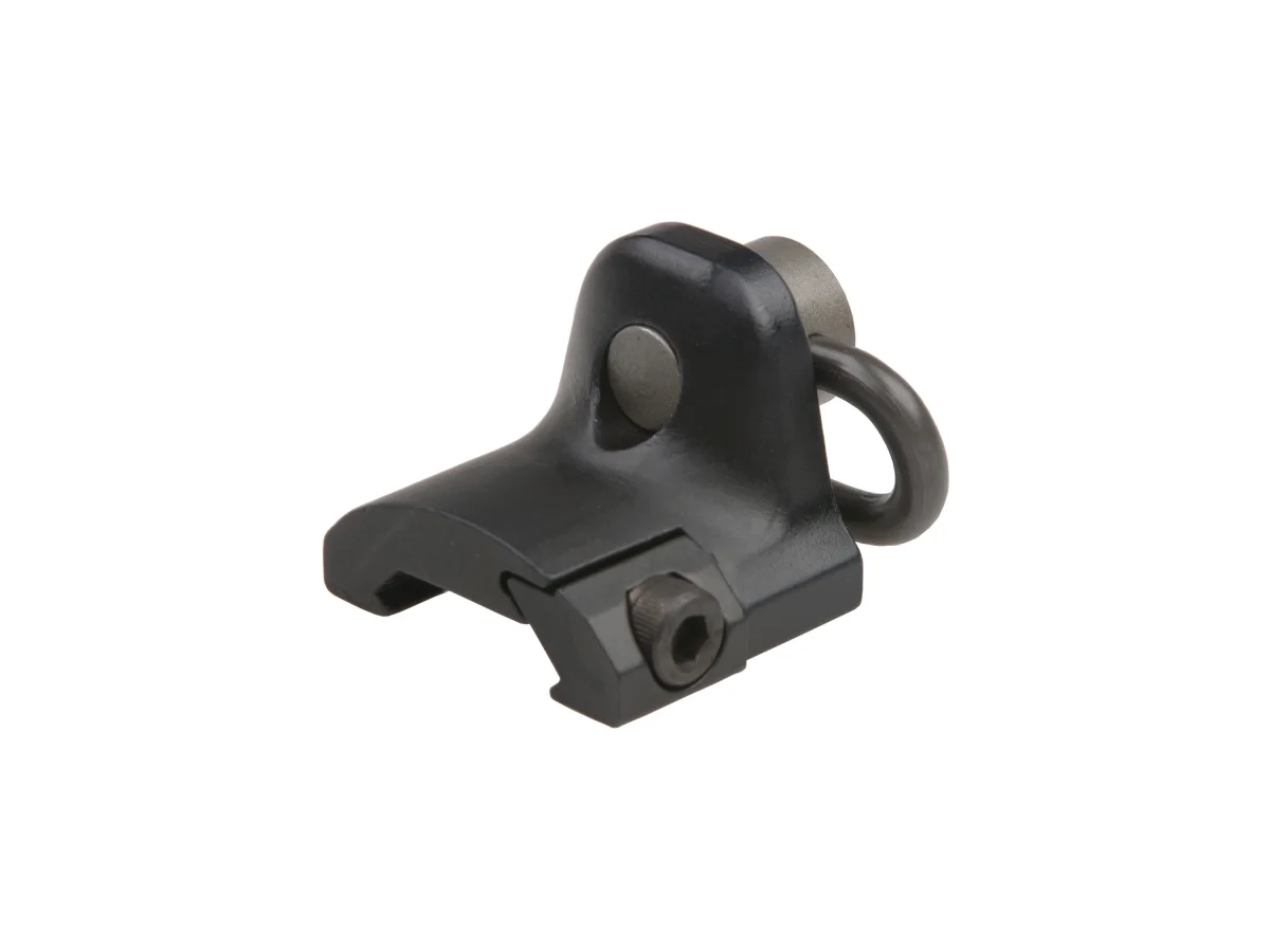 Swivel tactical sling made entirely of metal. Adjustable to fit 22mm RIS. The QD system allows for quick detachment by simply pressing a button. It is contoured to function as a support for your hand, preventing it from slipping off the front handle.