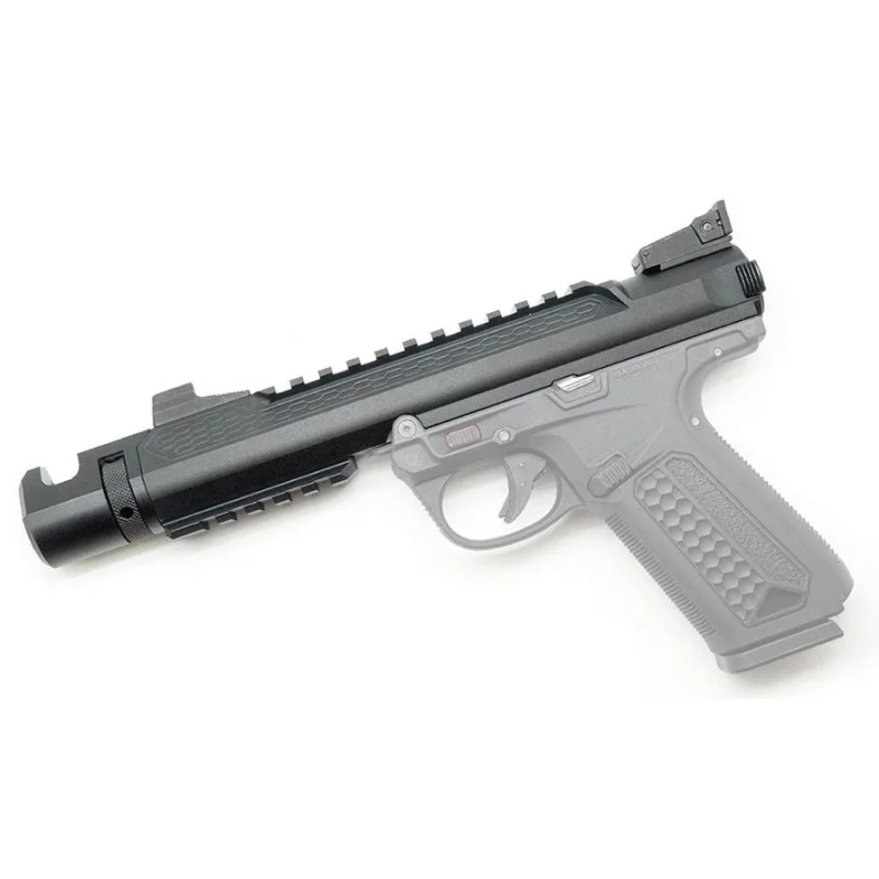 This component is called the upper or sleeve and is specially designed for the Action Army AAP01 platform, meant to replace the entire upper frame of the pistol. It is made by Action Army from CNC aluminum and its installation requires absolutely no modification or advanced knowledge of fine mechanics. Once mounted, you will benefit from a Picatinny rail on the top, adjustable sights, and a uniquely designed compensator that can be easily removed to make room for an additional tracer or suppressor. The thread is 14mm clockwise. Let's not forget the most important aspect, the fact that now the entire upper part is made of a solid piece of metal.