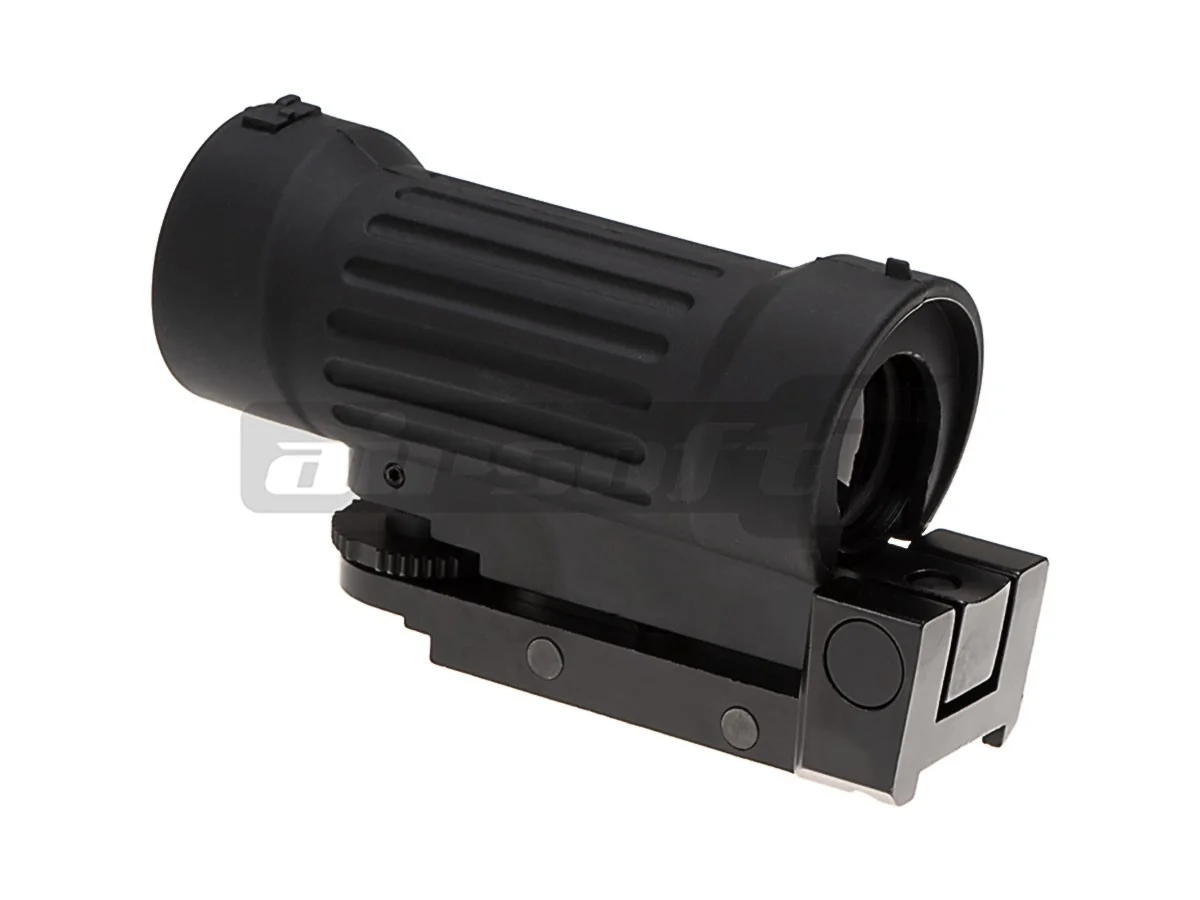 This sighting device is manufactured by Aim-O and is intended for airsoft replicas. It is made of aluminum and coated with matte black electrostatic paint, covered with rubber designed to absorb various shocks. It has a length of 165 mm and the central tube has a diameter of 30 mm. The objective has an internal diameter of 28 mm, allowing for good image clarity. The scope is firmly attached to the replica using two nuts.