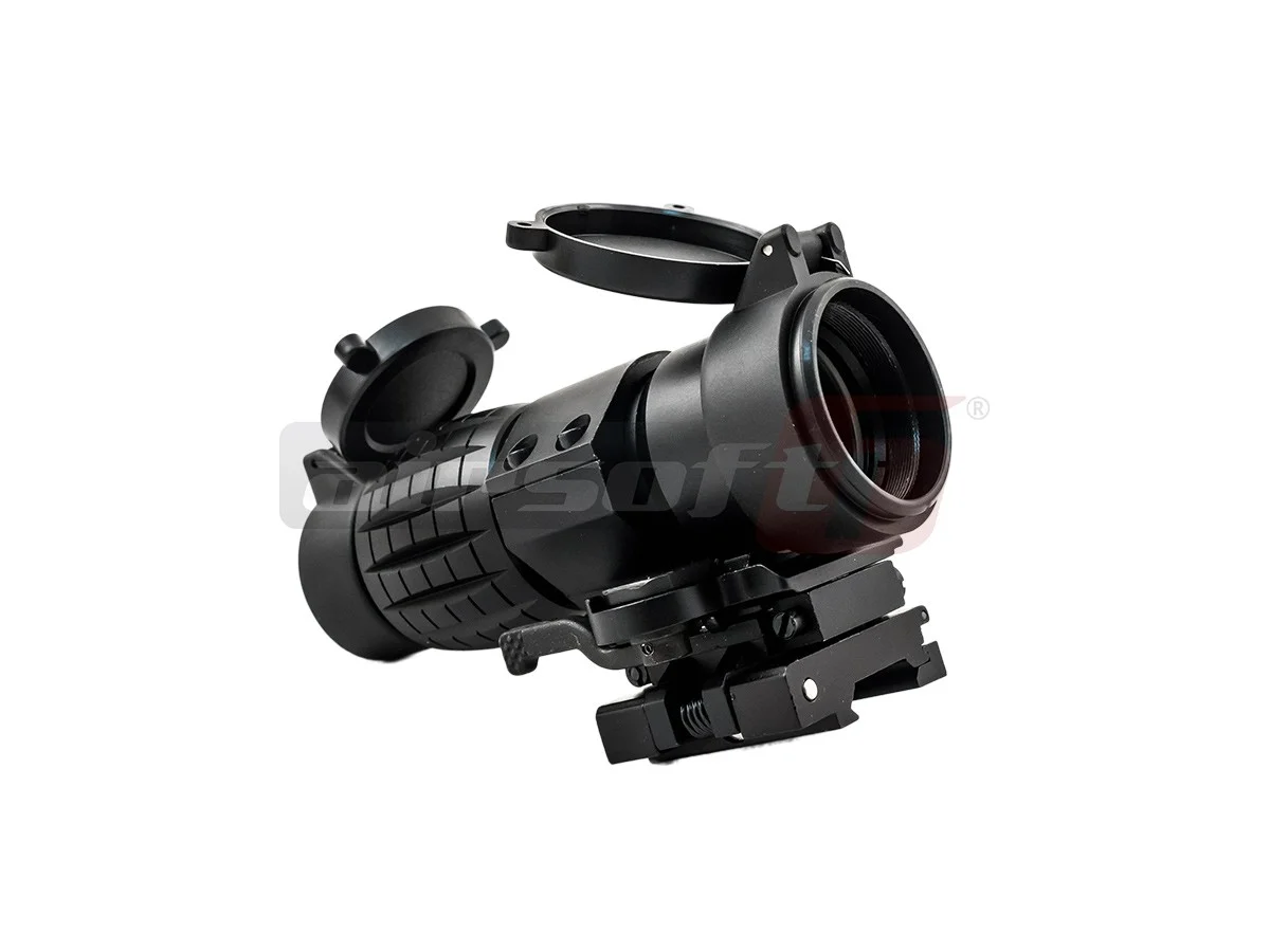 4x magnifier for electronic red dot sights. The magnifier does not have an internal reticle. It strictly serves the purpose of magnification, utilizing the reticle of the electronic sight if one is mounted on the replica.