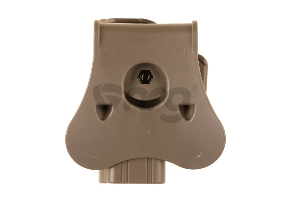 We are pleased to present the Amomax pistol holster designed for G17-18C platforms. This holster is designed to be attached directly to the belt or tactical gear with molle attachment systems using an adaptor. It is a rigid holster made of polymer plastic, and the pistol is secured in place using a large, easily accessible button. The advantage of this holster is its ease of use. It quickly attaches to the belt and once fixed, inserting and extracting the pistol is extremely fast yet secure. This holster allows for 360° rotation of the entire assembly.