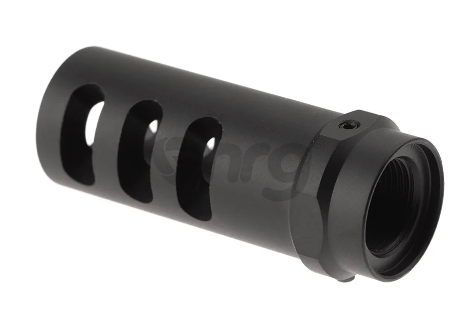 Ares flame suppressor designed for airsoft replicas with a counter clockwise thread. Made of aluminum, with a modern look. We recommend not to use thread adhesive, but only the original adjustment system of the replica when needed, or a rubber gasket.