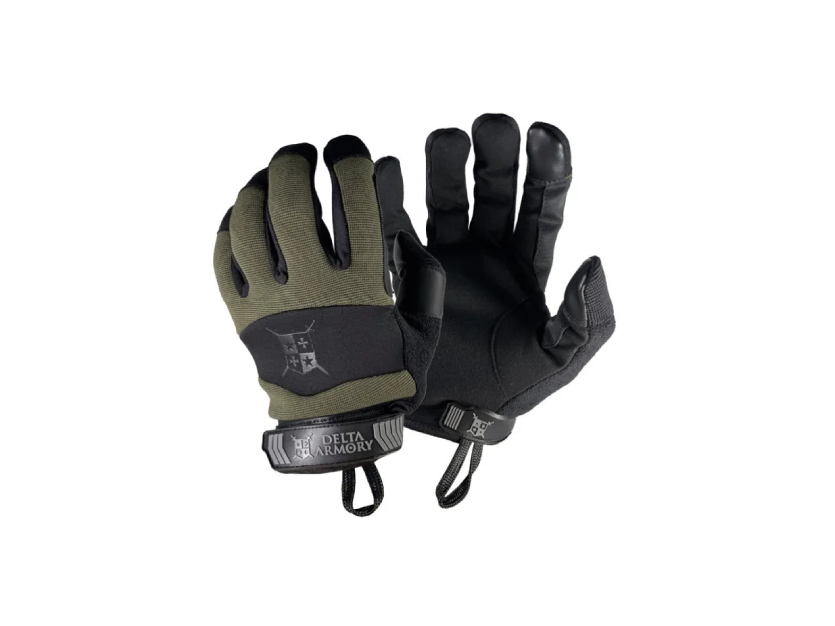 Delta Armory tactical gloves. The design and purpose of these gloves is to provide the user with easy operation of touchscreen devices, as well as the maneuverability and comfort needed to efficiently act in any situation. They are made of spandex, neoprene, and synthetic leather. The wrist of the glove is adjustable to prevent it from slipping off the hand.