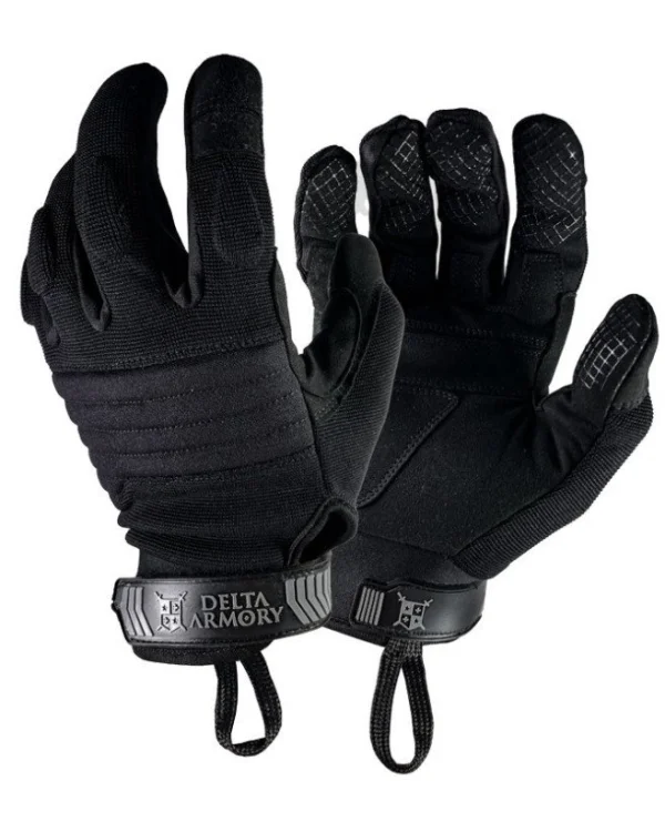 Delta Armory tactical gloves. The design and purpose of these gloves is to provide the user with easy operation of touchscreen devices, as well as the maneuverability and comfort needed to efficiently act in any situation. They are made of spandex, neoprene, and synthetic leather. The glove's wrist is adjustable to prevent slipping off the hand.