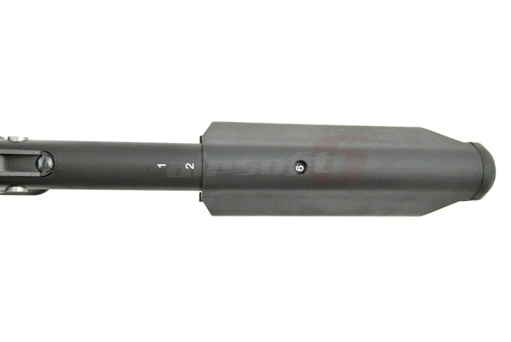 The center of gravity is slightly forward due to the rail system. This system allows for extensive customization. There is a rail section just above the dust cover to mount optical devices in a more comfortable position. The body of the airsoft replica is made from thick steel sheet, riveted. The markings are stamped. The joining parts of the airsoft replica are made from quality steel, contributing to better durability. The grip of the airsoft replica is of the SAW type, providing excellent hold, and the stock is a SOPMOD type adjustable with 6 positions. At the back, there is a quick-release sling attachment system. Note that a quick-release ring is not included in the package. The magazine of the airsoft replica is made from steel sheet.