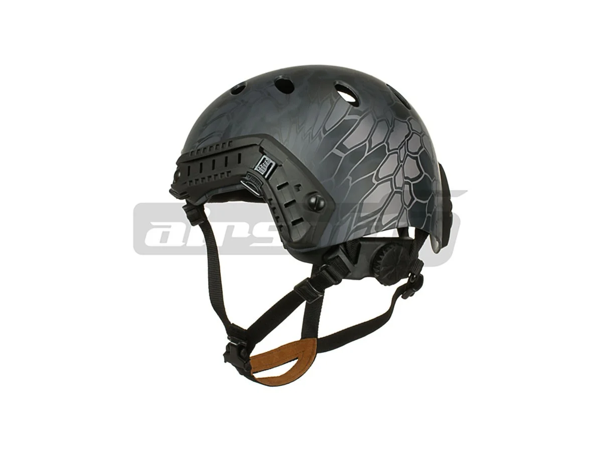 This helmet manufactured by FMA mimics the Ops-Core FAST Helmet. The helmet is made from plastic, and inside it features soft polystyrene and foam padding to enhance comfort. To ensure a secure fit on the head, it is equipped with a quick adjustment system around the head as well as a chin strap with a carabiner.