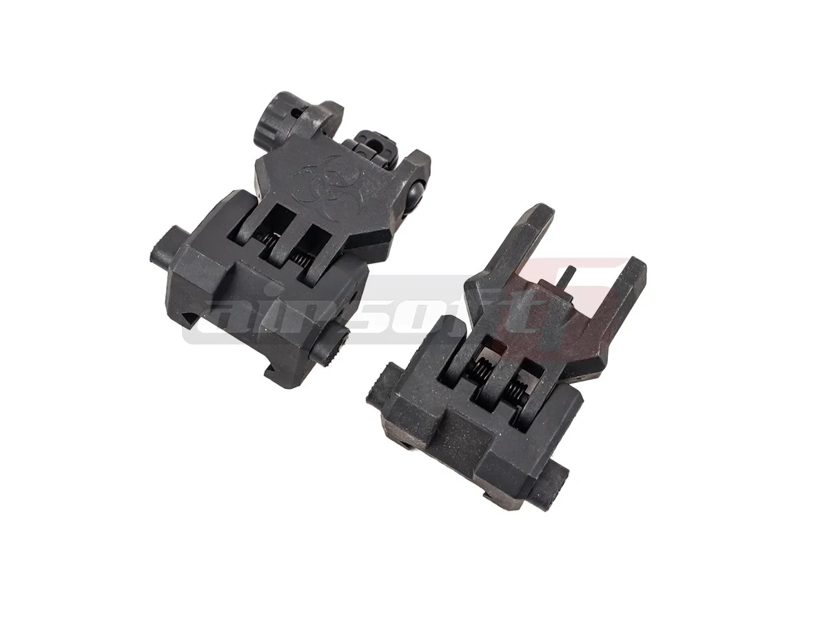 Black ABS plastic sights by FMA designed for airsoft replicas. The sights are foldable and can be used with other sighting systems.