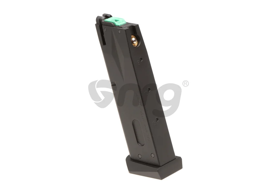 Magazine produced by G&G for the GPM9 MK3 platform. This magazine can be used with Green Gas or other similar type of gas. It is made of metal, with a plastic feeding lip. The magazine has a capacity of 27 6mm BBs.