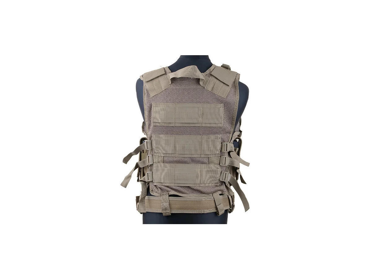 The tactical vest manufactured by GFC. This vest is a fixed platform made of durable nylon mesh with a high degree of breathability. A fixed platform means that the pockets are permanently attached. The pistol holster can be adjusted or removed. The pockets of the vest are as follows: 3 pockets on the upper left for pistol magazines, a large pocket on the upper right, 3 pockets for the main replica magazines on the lower right, a radio pocket on the left shoulder, a pistol holster with a magazine pocket that can be mounted on the lower left, a magazine pocket on the left side, and a long pocket mounted on the belt.