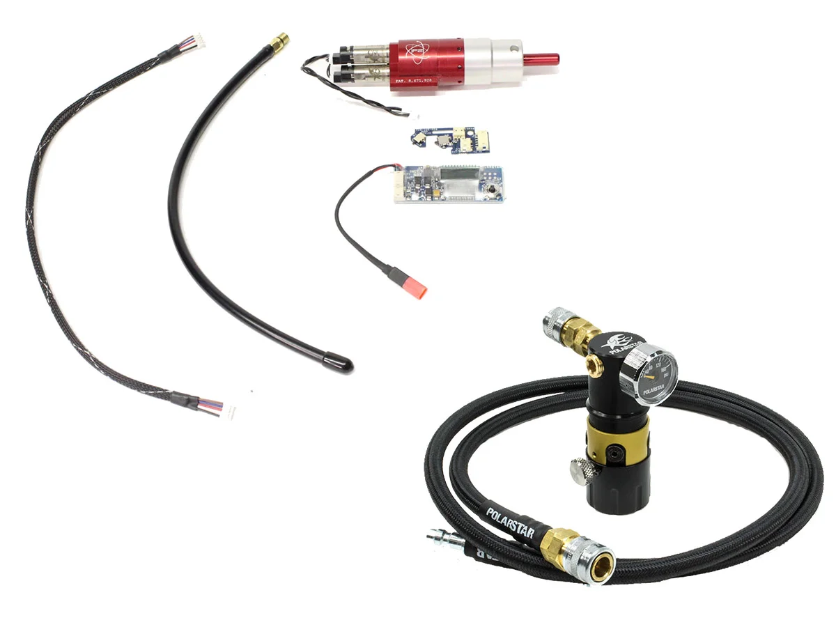 The package includes an HPA air regulator provided by Polarstar model MRS. This regulator combines all the technologies used so far by Polarstar to provide users with the best experience. It is equipped with all the important systems such as a pressure gauge and tournament lock. Also included in the package is a hose manufactured by Polarstar intended for HPA systems. This extremely flexible hose is made of rubber and is covered with a braided nylon material, thus reducing the risk of damage or tangling. The hose is delivered with US type QD fittings.
