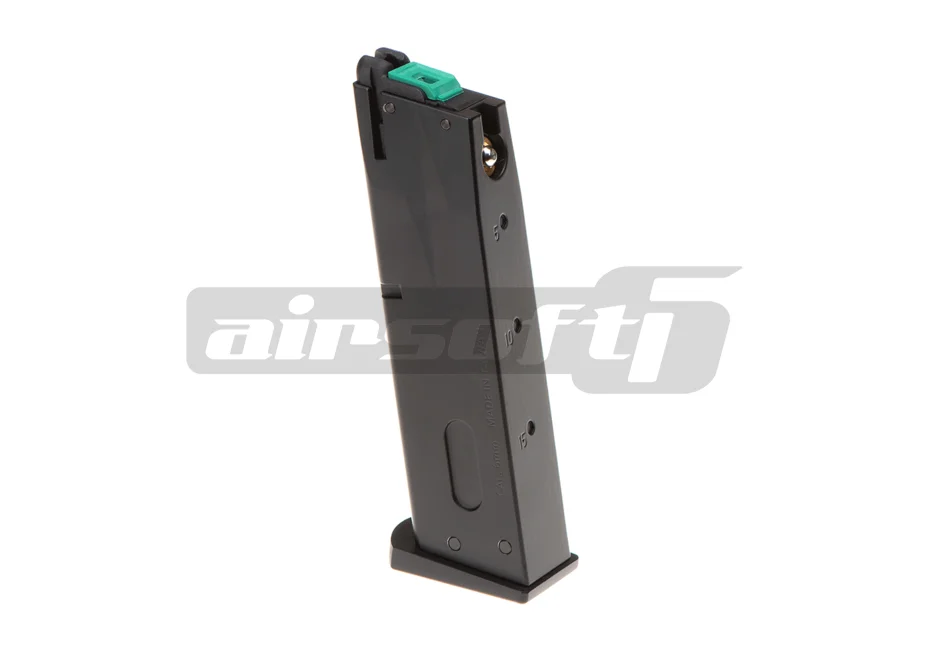 Magazine produced by G&G for the GP92 series airsoft pistols. This magazine can be used with Green Gas or other gas variants with similar properties. It is constructed from metal, while the BB feed nozzle is made of plastic. The magazine capacity is 27 6mm BBs.
