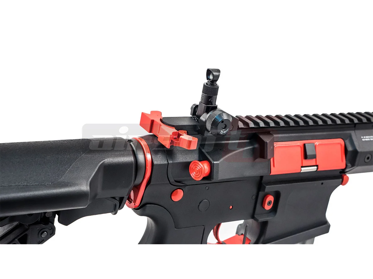 We are pleased to present the new range of G&G products, the CM16 SR series. The model at hand is the XL variant, featuring red details. This series is part of the intermediate category offered by G&G. Yes, indeed, the body of the airsoft replica is made from plastic material. It is reinforced fiberglass, which many players consider more durable than certain metals used in other airsoft replicas. However, the toy is not made entirely from this plastic material. Certain connecting elements and some components and accessories are made from metal to provide the airsoft replica with improved durability. Some of these elements include; the outer barrel, the Key Mod front mounting system, and the stock tube. The magazine catch of the airsoft replica is ambidextrous. The airsoft replica is equipped with a foldable sight system to allow the mounting of an advanced sight system. The stock of the replica features a new crane design that allows for battery storage plus additional storage spaces.