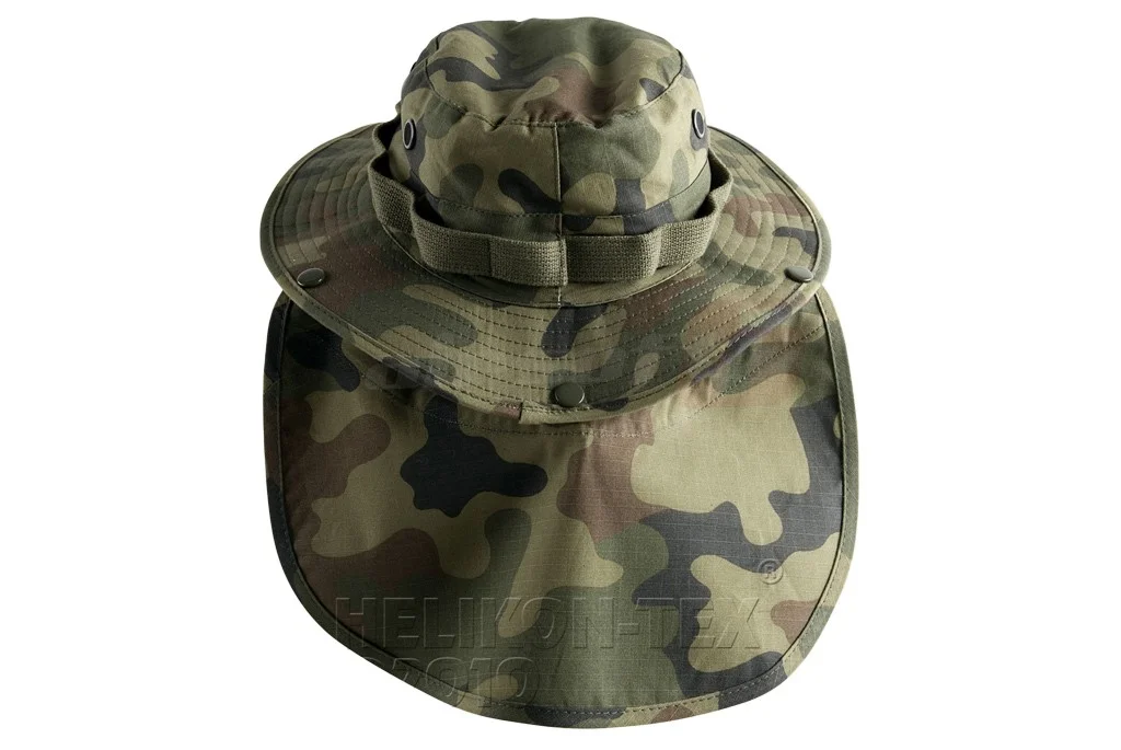 This hat is manufactured according to U.S. Army standards. This type of hat is used in forest or desert environments, providing protection against sun and rain. The material used is 100% cotton. There are vents on the top for excess heat evacuation and a reinforced nylon band to attach various accessories such as vegetation for camouflage or protective nets. At the back, there is an additional section of material designed to protect the nape of the neck. This section is detachable. To secure the hat, there is a cord with a carabiner at the bottom.