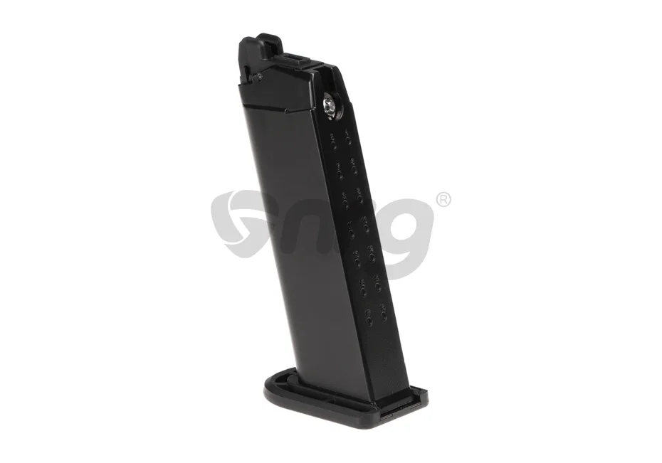 This magazine is manufactured by HFC. It has a capacity of 26 rounds and operates with Green Gas.
