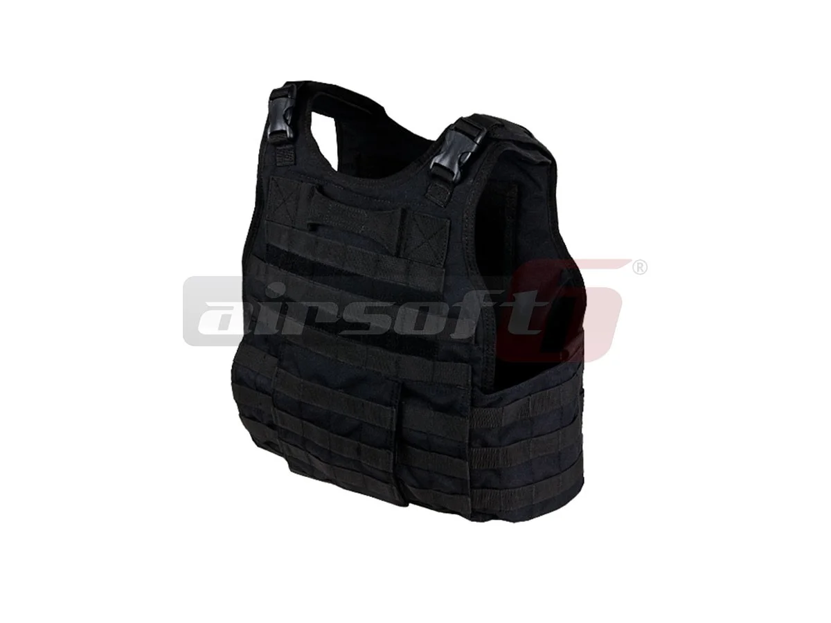 This is a MOLLE platform manufactured by Invader Gear. MOLLE attachment systems are found on almost the entire surface of the vest, allowing for optimal customization. The dimensions of the vest are adjustable, both in width and height. It is made from nylon material and the attachment clips are made of ABS plastic. At the top of the back, there is a section equipped with Velcro to attach badges or patches. Also at the top of the back, there is a handle that is normally used for dragging the wearer. Securing the vest on the wearer is as simple as possible. The sides converge at the front and are secured with Velcro under the MOLLE front section.