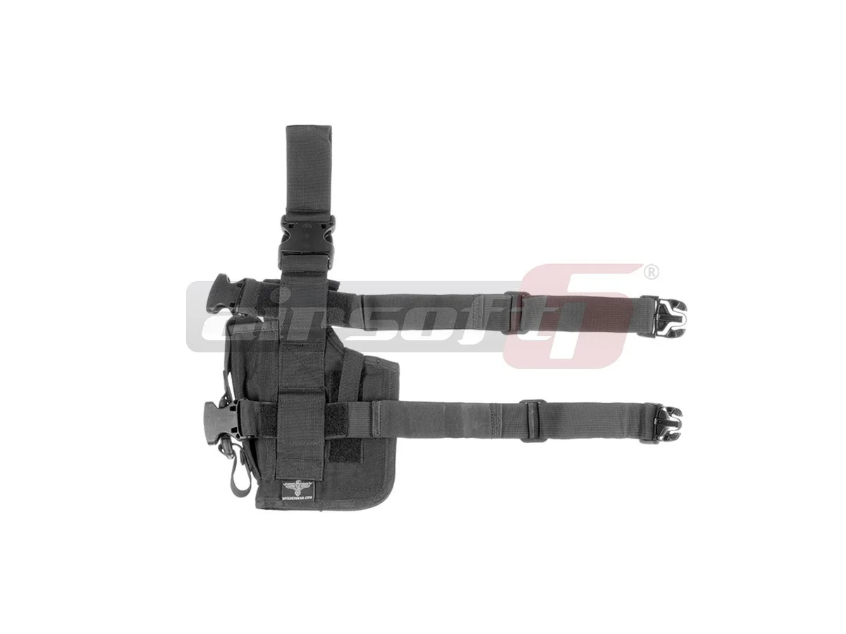 Thigh holster with attachment for belt and thigh. This holster is not adjustable, but its dimensions and shape ensure the secure fit of a wide variety of airsoft pistols. The front of the holster features a magazine pouch, while the outer part includes two additional pouches secured by buckles. The pistol retention system is adjustable, providing a snug fit depending on the model of the pistol used. The strap attachments and buckles are made from durable plastic, and the attachments are adjustable, improving user comfort. This holster cannot be mounted directly on a belt as it is specifically designed for the thigh.
