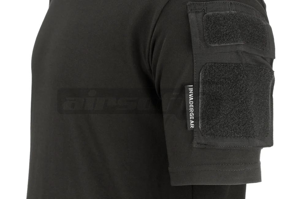 Short-sleeved tee model offered by Invader Gear, intended for use in activities such as sport shooting or other tactical-military operations. The material used is 80% cotton and 20% polyester. The design of the tee is classic, but the collar is slightly thickened for comfort, and there are ripstop pockets on the sleeves covered with Velcro for securing badges or patches.