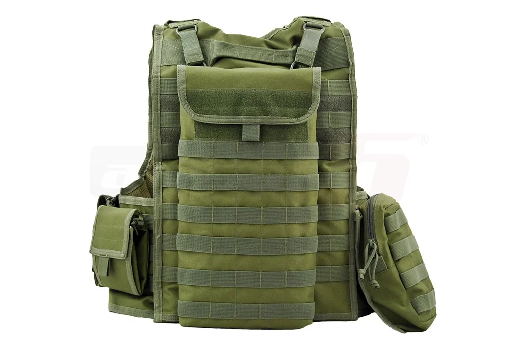 This tactical vest is a MOLLE platform manufactured by Invader Gear that comes with a set of accessories designed to provide the user with a complete vest and pouch system. The base platform is made from nylon material and is covered on a large part of the surface with MOLLE attachment systems. The dimensions of the vest are adjustable in both width and height, allowing for a secure fit on the user's body. In addition to the extra pouches, the front of the vest can hold 4 M4/M16 magazines secured with elastic straps.