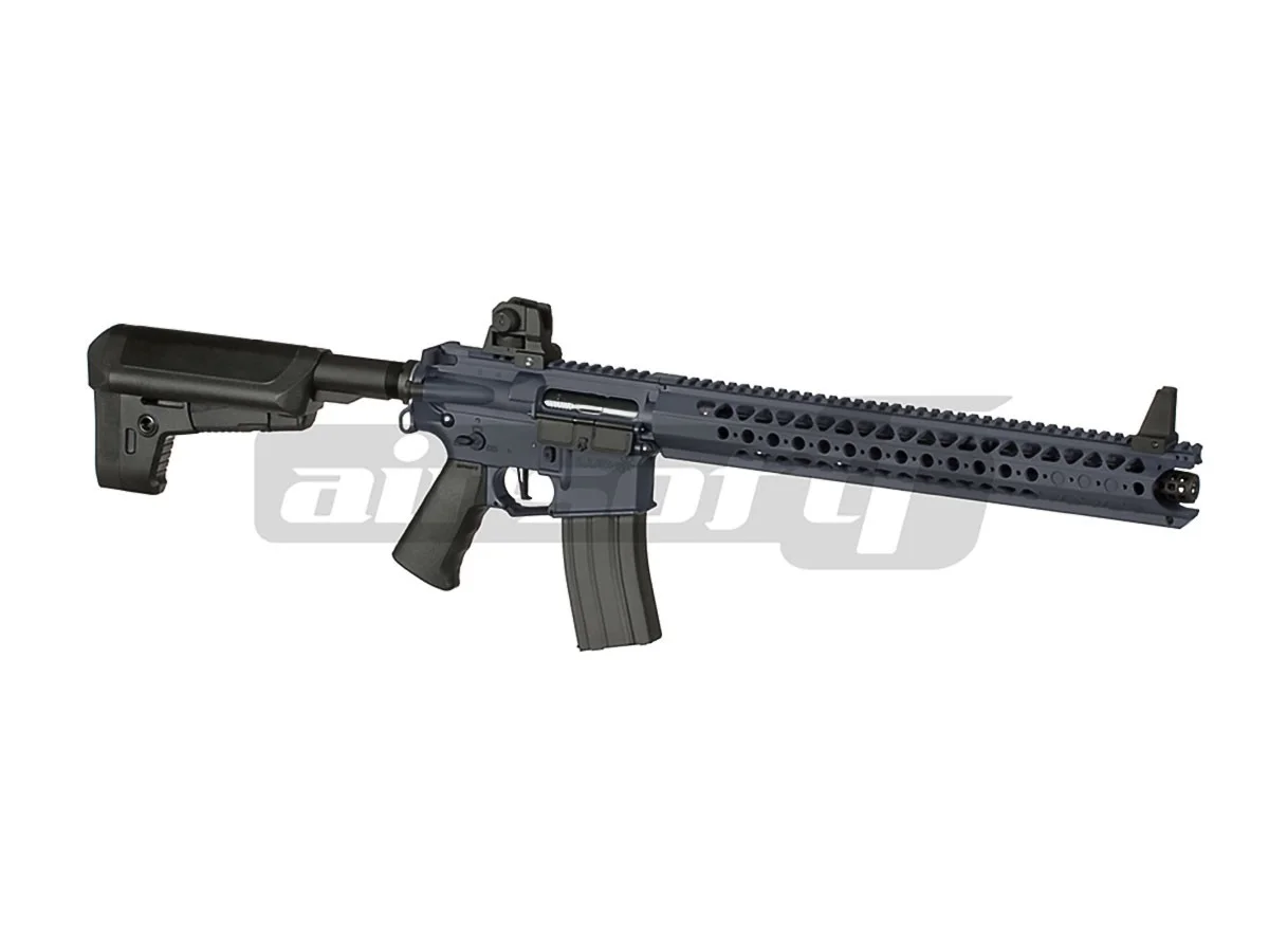 This model is called the Trident LVOA-C and is designed for both close-quarter battles and open spaces. The total length of the replica with the stock extended is 910 mm, placing it in the medium to long category. It is made from aluminum alloys, significantly reducing weight and greatly improving maneuverability. The weight of the replica is 3.3Kg. Along the entire top of the replica, there is a standard rail on which classic sights or an advanced sighting system can be mounted. The body of the replica represents the interesting part of this version due to modern elements intended to enhance both the aesthetic and practical enjoyment of owning and operating such a replica. Above the grip, there is an ambidextrous sling attachment system. The grip features a new design aimed at improving hold. The fire selector is also ambidextrous, and that's about it for left-handed users. The mag catch is on the right side. The stock of the replica features a unique, elegant design that allows for the storage of a crane-type battery. The stock is adjustable with 6 positions.
