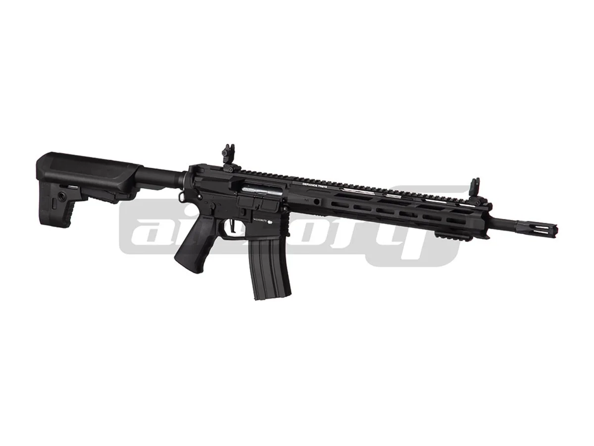 This model is called the Trident SPR MK2 and is designed for both close-quarters combat and open spaces. The total length of the replica with the stock extended is 945 mm, placing it in the medium to long category. It is made from aluminum alloys, significantly reducing weight and greatly improving maneuverability. The weight of the replica is 2500. The front system is of the M-Lok type, so it will not unnecessarily obstruct you with rails when not needed. There is a standard rail along the entire top of the replica where classic sights or an advanced sighting system can be mounted. The body of the replica represents the interesting part of this version due to modern elements aimed at enhancing both the aesthetic and practical enjoyment of owning and operating such a replica. Above the grip, there is an ambidextrous attachment system for the sling. The grip features a new design aimed at improving hold. The fire selector is also ambidextrous, and that's about it for left-handed users. The mag catch is on the right side. The stock of the replica features a unique, elegant design that allows for the storage of a crane-type battery. The stock is adjustable with 6 positions.