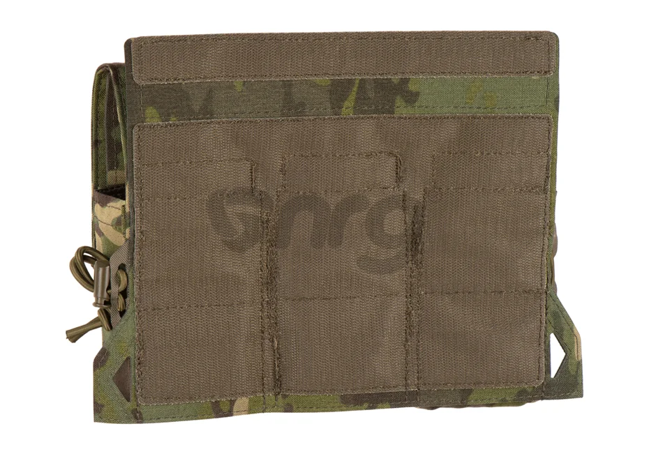 The panel is sewn from a 500D Cordura laminate with an IRR treatment, backed by a reinforced 1000D layer and fastened with velcro hooks. Three integrated magazine pockets accommodate two standard AR/AK magazines each for a total of six. The supports are secured with a velcro flap and further fixed with a shock cord on the side for a firm and stable placement of the carried equipment.