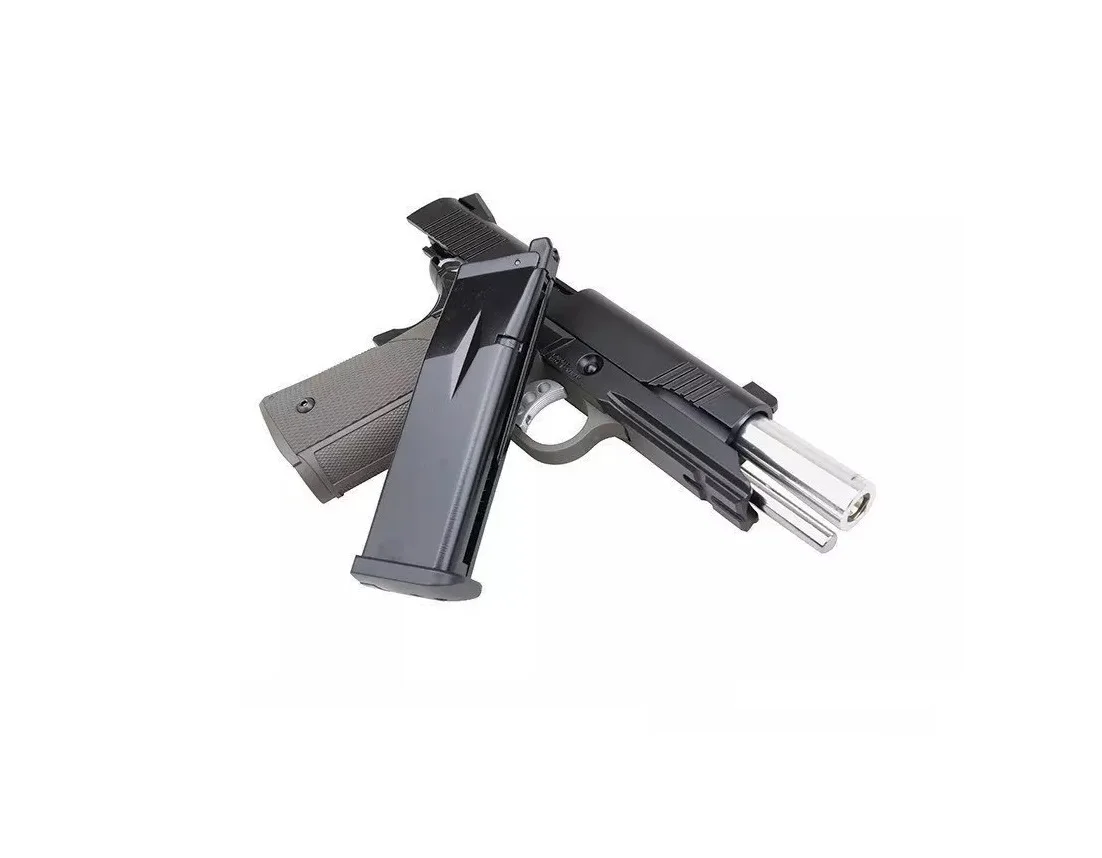 This toy replica is manufactured by KJW mostly from metal. Due to the Hi-Capa platform, the handle is made of quality ABS plastic. This contributes to reducing the weight, and in case of damage, only this component can be easily replaced. The airsoft replica finishes are very good, with the outer barrel being chromed and the paint applied on the other components being very resistant. The rear sight is adjustable. This toy replicates the safety elements specific to the 2011 model, namely; the grip safety, which prevents cocking the hammer without a firm grip on the pistol, and the ambidextrous thumb safety.