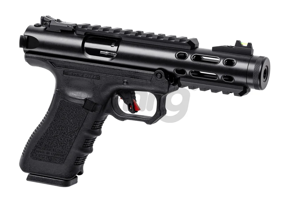 The handle of this pistol is based on the G17/18 platform and is made of ABS plastic. The upper part is made of a single piece of metal and has a cylindrical shape. At the rear end, there is the cocking lever and at the top, there is a set of easy-to-use sights and a Picatinny rail for mounting accessories. At the front, there is a hidden reverse-threaded 14mm thread under the protective cover, and at the bottom-front there is another Picatinny rail for mounting additional tacti-cool accessories.
