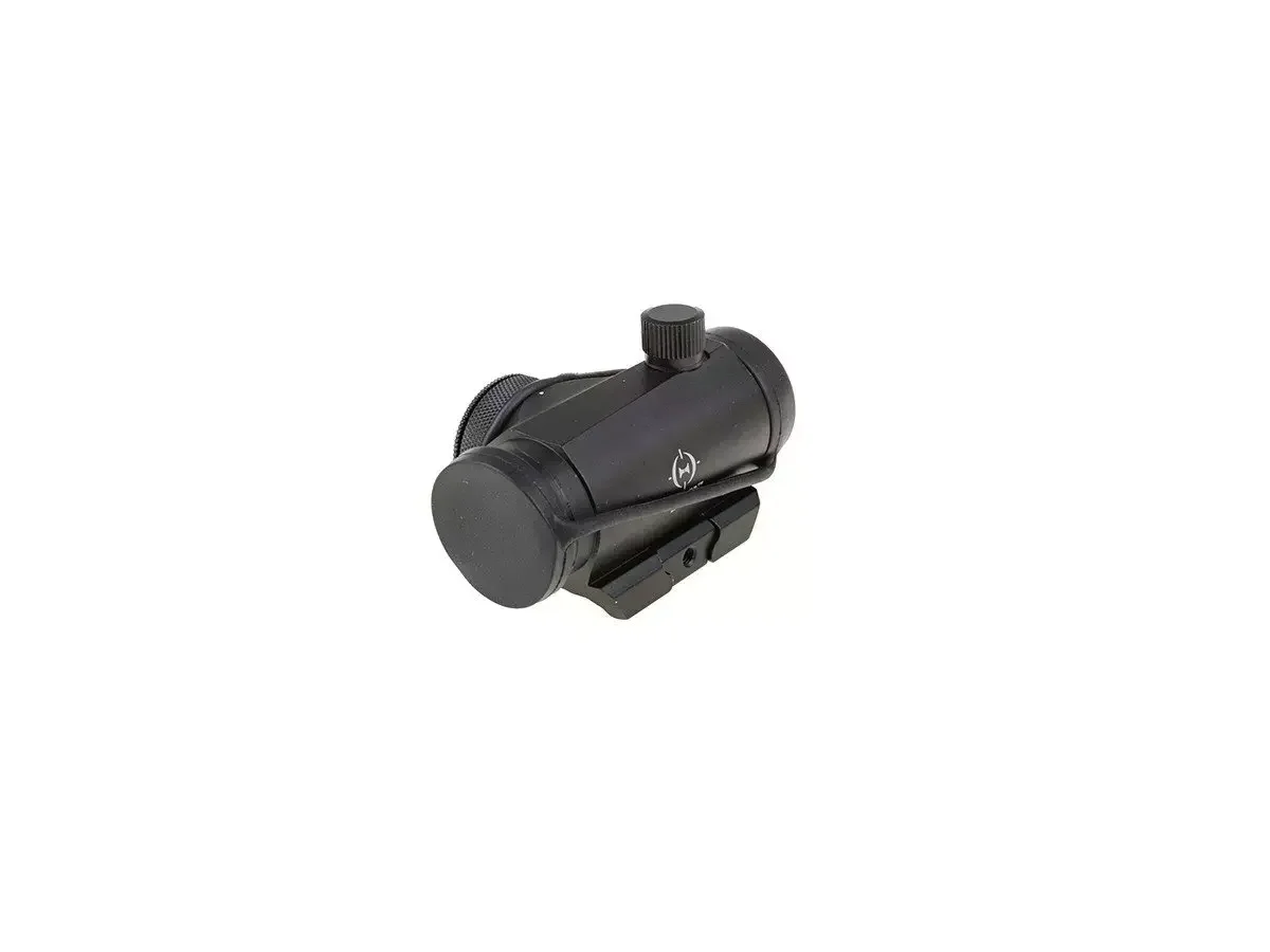 This electronic device is used to facilitate aiming when using airsoft replicas. It is made of aluminum, making it lightweight and resistant. It can be mounted on a standard Picatinny rail and secured with two screws. There are adjustment screws on the left and top sides for adjusting the height and lateral position of the aiming point. It is powered by a CR2032 battery stored inside the ON/OFF switch and intensity adjuster located on the top. The illuminated dot can be either red or green in color.