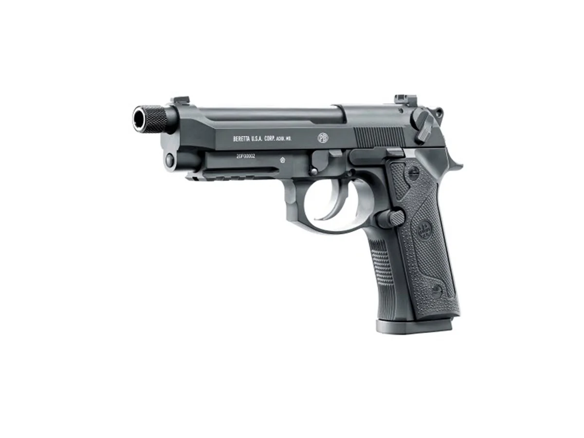 This airsoft replica produced by Umarex mirrors the M9A3, replicating both its exterior appearance and functionality. The slide is made of metal while the body is made of plastic. The recoil has a strong sound and a considerable kick. At the front, there is a rail for mounting tactical accessories such as lasers or flashlights. The outer barrel is threaded, allowing the attachment of a 14mm counter-clockwise suppressor. The safety is ambidextrous, located above the grip behind the slide. On the right side, there is the button for removing the magazine.