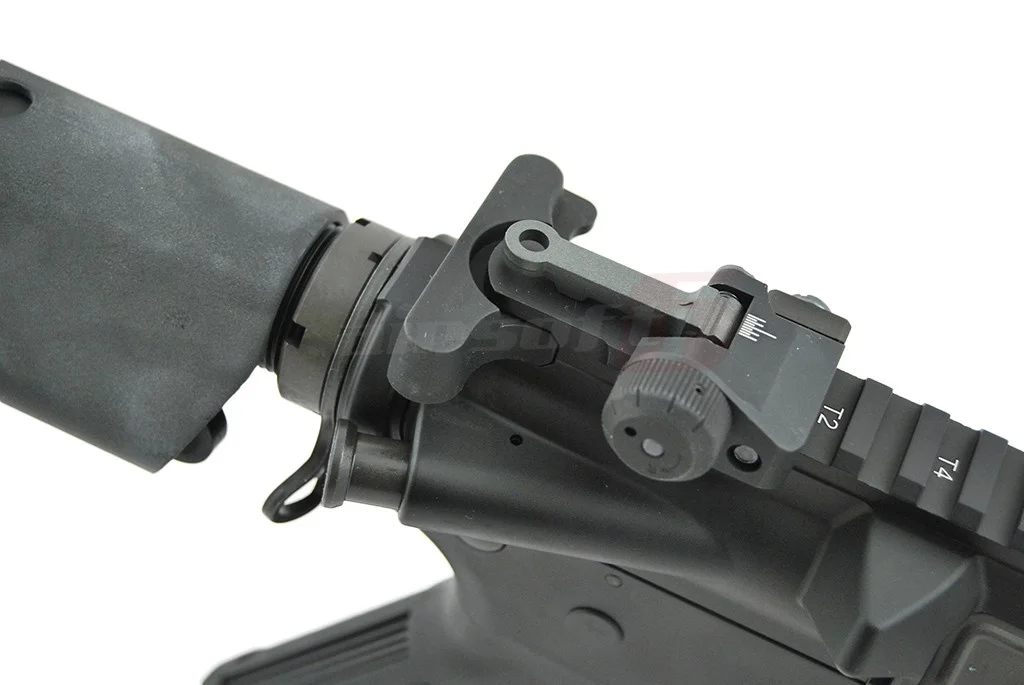 Aiming is achieved using adjustable metal flip-up sights. At the rear, there is a rigid sling attachment system, providing security during transport of the airsoft replica. The dust cover of the replica is functional and features a "bolt stop" function to facilitate hop-up adjustment.