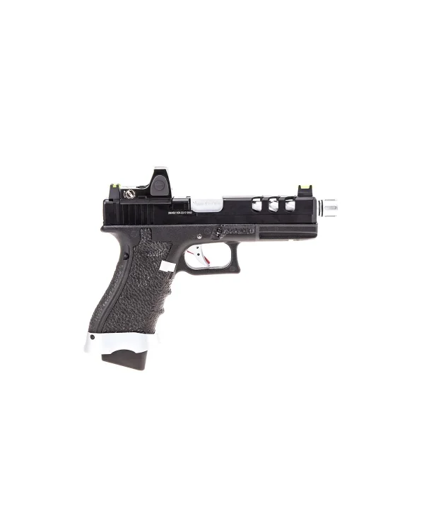 The EU17 BDS Vented model replicates a well-known platform, making accommodation quick and easy. The pistol is made from premium materials and assembled with great attention. The slide is made of aluminum while the grip is made from nylon fiber. The serrations on the slide will allow you to rack the slide more easily, and the stippling on the grip will provide a firm hold during operation. With the included red-dot in the package, you will be able to aim much more easily. At the front, there is a non-standard rail where you can mount certain lasers or tactical flashlights. The outer barrel features a beautiful design and at the front, there is a covered 14mm counter-clockwise thread. The package includes 2 sighting systems, one with fluorescent elements, high, and one standard. The back grip panels can be changed, with 2 additional sizes included in the package.