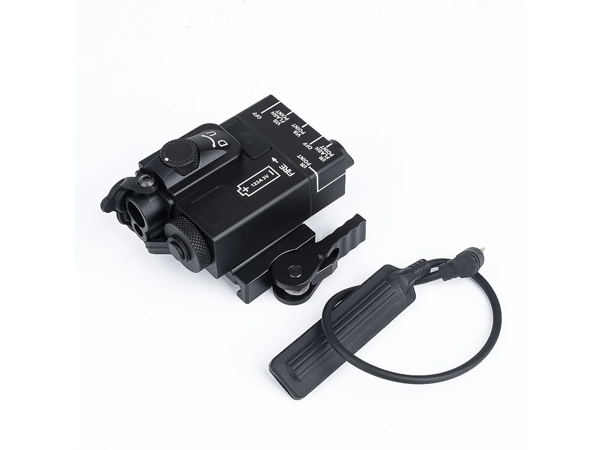 The buttons for operating the device are located at the back, and the package also includes a wired on/off momentary switch. The operating modes can be used in various combinations such as; laser, IR laser, laser flash. The laser beam is adjustable in height and laterally with the help of large buttons located on the exterior of the device.