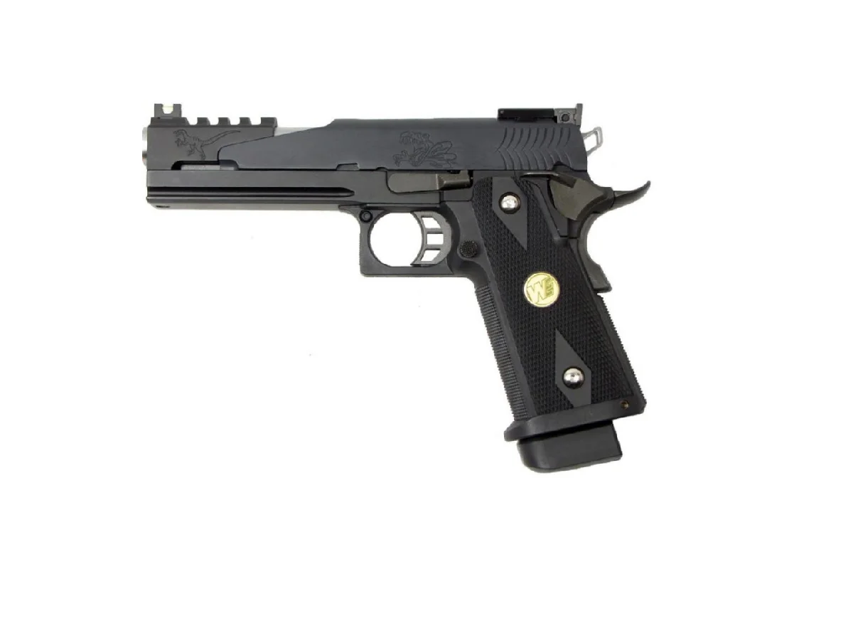 This pistol replica named Dragon, manufactured by WE, is built around the hi-capa platform and is made from metal and ABS plastic. The sleeve and frame are made of metal while the grip is made of ABS plastic. The design of this pistol is quite modular compared to other platforms on the market.