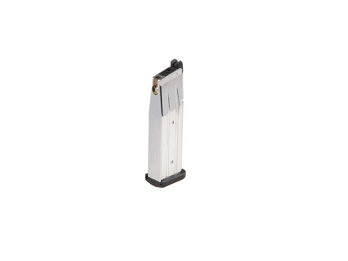 Magazine produced by WE for HiCapa 5.1 series airsoft pistols. This magazine can be used with Green Gas or other gas variants with similar properties. It is constructed from metal, while the BB feed lip is made of plastic. The magazine capacity is 31 6mm BBs.
